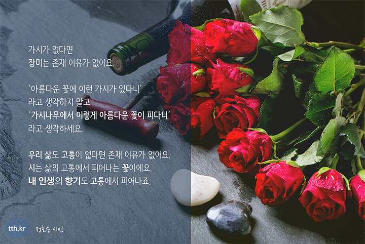 우리 삶도 고통이 없다면 존재 이유가 없어요. 시는 삶의 고통에서 피어나는 꽃이에요. 내 인생의 향기도 고통에서 피어나죠.