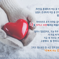 전체 글3527 자신을 존귀하게 여길 줄 아는 사람이 남들도 존귀하게 여길 줄 안다는 사실을 잊지 마세요. 지금 내 자신을 쓰다듬으며 고생했다, 말 한마디 해주세요. 자신을 존귀하게여길 줄 아는 사람이남들도 존귀하게 여길 줄 안다는사실을 잊지 마세요. 저녁식사로혼자 라면을 끓여 먹더라도나를 아끼고 사랑해주는마음으로 드세요. 얼마나 힘들었어요,오늘 하루 이 몸 끌고이 마음 써가며 사는 것. 지금 내 자신을 쓰다듬으며고생했다, 말 한마디 해주세요. 그리고 평소보다한 시간 먼저 잠을 청하세요.나에게 주는 선물입니다. - 혜민스님 명언 - 좋은글귀 2016. 12. 29. 더보기 ›› 최선을 다하고자 결심하는 순간, 신도 감동을 받는다. 결코 상상할 수 없는 여러 가지 일들이 나를 도와준다. 최선을 다하고자 결심하는 순간,신도 감동을 받는다.결코 상상할 수 없는 여러 가지 일들이 나를 도와준다.결정의 순간을 시작으로 수많은 사건들이 일어나며,어떤 누구도 자신에게 이런 일이 일어날 거라고 생각하지 못했던온갖 종류의 예기치 않던 사건들과 만남과 물질적 원조가 나의 힘이 되어준다. - 요한 볼프강 폰 괴테 꿈ㆍ비전 - 명언 2016. 12. 28. 더보기 ›› 우리의 꿈은 뒤에 오는 사람들이 우리를 딛고 우리 위에서 이루게 하는 것입니다 우리의 꿈은,뒤에 오는 사람들이 우리를 딛고우리 위에서 이루게 하는 것입니다. 나는 평생을창조적인 작업을 위해서 살아왔습니다.누가 하라고 해서 한 것이 아니라그것이 나의 삶 그 자체의 즐거움이었기 때문입니다. - 상상력의 거미줄 책 - 좋은글 2016. 12. 27. 더보기 ›› 소중한 사람을 만나는 것은 1분이 걸리고 그와 사귀는 것은 한 시간이 걸리고 그를 사랑하게 되는 것은 하루가 걸리지만, 그를 잊어버리는 것은 일생이 걸린다는 말이 있다. 살아 보니까내가 주는 친절과 사랑은밑지는 적이 없다. 소중한 사람을 만나는 것은 1분이 걸리고그와 사귀는 것은 한 시간이 걸리고그를 사랑하게 되는 것은 하루가 걸리지만, 그를 잊어버리는 것은일생이 걸린다는 말이 있다. 그러니 남의 마음속에좋은 기억으로 남는 것만큼보장된 투자는 없다. - 장영희, ‘살아온 기적, 살아갈 기적’에서 인간관계 - 명언 2016. 12. 27. 더보기 ›› 당신이 뿌린 생각과 말, 행동과 감정의 씨앗들은 당신의 삶에 심겨져 언젠가는 열매를 맺습니다. 부메랑 효과 당신의 생각, 행동, 말, 신념, 감정 등은공중에 흩어져서 사라지는먼지 같은 것이 아닙니다. 그것은 당신을 움직이고인생의 방향을 결정 짓습니다. 당신이 뿌린 생각과 말행동과 감정의 씨앗들은당신의 삶에 심겨져언젠가는 열매를 맺습니다. 악하고 부정적인 생각과 말은좌절과 절망의 열매를,선하고 긍정적인 생각과 말은소망과 성취의 열매를 맺을 것입니다. - 나를 위한 하루 선물 책 - 좋은글 2016. 12. 26. 더보기 ›› 공이 튀는 방식을 불평하는 사람은 대개 그것을 받아치지 못하는 사람이다. 공이 튀는 방식을불평하는 사람은 대개 그것을 받아치지못하는 사람이다. - 루 홀츠 명언 - 좋은글귀 2016. 12. 25. 더보기 ›› 사랑은 편안합니다. 사랑은 따뜻합니다. 사랑은 자유롭습니다. 사랑은 아이처럼 순수합니다. 사랑은 다른 의도가 없습니다. 사랑은 편안합니다.사랑은 따뜻합니다.사랑은 자유롭습니다.사랑은 아이처럼 순수합니다.사랑은 다른 의도가 없습니다. - 혜민스님 명언 - 좋은글귀 2016. 12. 25. 더보기 ›› 살면서 고마움을 많이 느낄수록 더 행복해집니다. 세상에 나 혼자 똑 떨어져 있는 "외로운 나"가 아니고, 서로서로 연결된 "사람들 속의 나"를 느끼기 때문입니다. 살면서 고마움을 많이 느낄수록더 행복해집니다. 세상에 나 혼자 똑 떨어져 있는"외로운 나"가 아니고, 서로서로 연결된"사람들 속의 나"를 느끼기 때문입니다. 고마움을 느낄 때우리는 진리와 더 가까이 있습니다. - 혜민스님 명언 - 좋은글귀 2016. 12. 25. 더보기 ›› 이익을 얻으면 그 이익은 누군가의 은혜에 의한 것이니 나 또한 은혜를 베풀어야 한다. 목표를 이룬 사람들은 ‘나눠야 더욱 넘치고 행복해진다’고 강조한다. 이익을 얻으면 그 이익은누군가의 은혜에 의한 것이니나 또한 은혜를 베풀어야 한다. 목표를 이룬 사람들은‘나눠야 더욱 넘치고 행복해진다’고강조한다. - 주역 인성ㆍ성품 - 명언 2016. 12. 24. 더보기 ›› 타인의 사랑을 받아야지만 밝은 얼굴이 되지 마시고, 밝은 얼굴이 타인의 사랑을 불러일으킵니다. 타인의 사랑을 받아야지만밝은 얼굴이 되지 마시고, 밝은 얼굴이타인의 사랑을 불러일으킵니다. - 생각을 뒤집으면 인생이 즐겁다 명언 - 좋은글귀 2016. 12. 23. 더보기 ›› 눈앞을 보기 때문에 멀미를 느끼게 됩니다. 몇 백 킬로 앞을 보십시오. 바다는 기름을 제거한 것처럼 평온합니다. 저는 그런 장소에 서서 오늘을 지켜보고 사업을 하고 있기 때문에 전혀 걱정.. 눈앞을 보기 때문에 멀미를 느끼게 됩니다.몇 백 킬로 앞을 보십시오.바다는 기름을 제거한 것처럼 평온합니다. 저는 그런 장소에 서서 오늘을 지켜보고사업을 하고 있기 때문에 전혀 걱정하지 않습니다. - 손정의 소프트뱅크 회장 꿈ㆍ비전 - 명언 2016. 12. 22. 더보기 ›› 간단하