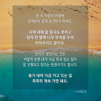 전체 글3527 마치 내 꿈이 벌써 이루어진 것처럼 자신감을 가지고 행동하세요. 그러면서 열심히 준비하세요. 그러면 신기하게도 그 꿈은 이루어집니다. 마치 내 꿈이 벌써이루어진 것처럼자신감을 가지고 행동하세요. 그러면서 열심히 준비하세요.그러면 신기하게도그 꿈은 이루어집니다. - 혜민스님 명언 - 좋은글귀 2016. 7. 6. 더보기 ›› 한 두 사람의 비평에 상처받아 쉽게 포기하지 마세요. 나에 대해 잘 알지도 못하고 쉽게 한 말에 너무 무게를 두어 아파하지도 말아요. 한 두 사람의 비평에상처받아 쉽게 포기하지 마세요. 나에 대해잘 알지도 못하고 쉽게 한 말에너무 무게를 두어아파하지도 말아요. 안티가 생긴다는 것은,어떻게 보면내가 지금 하고 있는 일이잘 진행되고 있다는반증이기도 합니다. 용기내여 지금 가고 있는길,묵묵히 계속 가면 돼요. - 혜민스님 명언 - 좋은글귀 2016. 7. 6. 더보기 ›› 내 인생을, 사랑하는 사람을 통해 살려고 하지 마십시오. 그 사람의 인생을 살도록 놓아주는 것이 진정한 사랑입니다. 사랑이란있는 그대로를 사랑해주는 것입니다.사랑하는 이가이랬으면 좋겠는데 하고 바라는 건사랑이 아닌 내 욕심의 투영입니다. 내 인생을, 사랑하는 사람을 통해살려고 하지 마십시오.그 사람의 인생을 살도록 놓아주는 것이 진정한 사랑입니다. - 혜민스님 명언 - 좋은글귀 2016. 7. 5. 더보기 ›› 마음이 힘들 때 그 힘든 이야기를 누군가에게 말하기만 해도 신기하게도 이전보다 편안해집니다. 마음이 힘들 때그 힘든 이야기를누군가에게 말하기만 해도신기하게도 이전보다 편안해집니다. 왜냐면 우리에겐괴로움을 준 사건도 사건이지만,그 일을 겪고 나서 세상에 버려진 듯나 혼자 버티고 있다는 점이더 힘들게 하기 때문입니다. 사람은 혼자 견딜 수 있는총량이 정해져 있습니다.말하세요. 혼자 참지만 말고 말하시고좀 편안해지세요. - 혜민스님 명언 - 좋은글귀 2016. 7. 3. 더보기 ›› 밤하늘 무수한 별들 가운데 하나를 봅니다. 지구의 많은 사람들 가운데 내가 지금 그 별을 봅니다. 사람과 사람의 만남도 이처럼 수천만 분의 일의 우연과 같은 필연으로 인연을 맺습니다. 밤하늘 무수한 별들 가운데 하나를 봅니다.지구의 많은 사람들 가운데 내가 지금 그 별을 봅니다.사람과 사람의 만남도이처럼 수천만 분의 일의 우연과 같은필연으로 인연을 맺습니다. - 멈추면, 비로소 보이는 것들 책 - 좋은글 2016. 7. 2. 더보기 ›› 예전처럼 일이 잘 안된다고, 비정상이라고 생각하지 마시고 잊고 있었던 진정한 내 삶의 가치를 일깨워 보세요. 일은 삶의 일부지 내 삶의 전부는 아닙니다. 예전처럼 일이 잘 안된다고,비정상이라고 생각하지 마시고잊고 있었던 진정한내 삶의 가치를 일깨워 보세요. 일은 삶의 일부지내 삶의 전부는 아닙니다. - 혜민스님 명언 - 좋은글귀 2016. 7. 2. 더보기 ›› 몸이든 마음이든 비우면 시원하고 편안해집니다. 반대로 안에 오랫동안 간직하고 있으면 몸이든, 마음이든 병이 납니다. 뭐든 비워야 합니다. 몸이든 마음이든비우면 시원하고 편안해집니다. 반대로 안에 오랫동안간직하고 있으면몸이든, 마음이든 병이 납니다. 뭐든 비워야 합니다. - 혜민스님 명언 - 좋은글귀 2016. 6. 30. 더보기 ›› 우리 마음이 세상을 향할 때는 바쁜 세상사에 쉽게 휩쓸려버리지만, 그 마음이 내면을 향해 있으면 아무리 세상이 소란스럽더라도 중심을 잃지 않고 평안을 찾을 수 있습니다. 우리 마음이세상을 향할 때는바쁜 세상사에 쉽게 휩쓸려버리지만,그 마음이내면을 향해 있으면아무리 세상이 소란스럽더라도중심을 잃지 않고평안을 찾을 수 있습니다. - 멈추면, 비로소 보이는 것들 책 - 좋은글 2016. 6. 30. 더보기 ›› 남들에게 행복하게 보이는 것이 중요한 것이 아니고 나 자신이 정말로 행복한 것이 중요합니다. 나에게 솔직해져 보십시오. 도대체 무엇이 나를행복하게 하는지.세상이 일방적으로 정해놓은성공의 기준이 아닌내 안에서 무엇을 원하는지 남들에게 행복하게 보이는 것이중요한 것이 아니고나 자신이 정말로 행복한 것이중요합니다. - 멈추면 비로소 보이는 것들혜민스님 책 - 좋은글 2016. 6. 29. 더보기 ›› 당신이 아름다운 이유는 다른 사람보다 더 멋있고 더 능력 있고 더 매력적이기 때문이 아닙니다. 세상에 당신 같은 존재가 당신밖에 없기 때문입니다. 당신이 아름다운 이유는다른 사람보다 더 멋있고 더 능력 있고더 매력적이기 때문이 아닙니다. 세상에 당신 같은 존재가당신밖에 없기 때문입니다.특별한 당신을 당신부터 사랑하십시오. - 멈추면 비로소 보이는 것들혜민스님 책 - 좋은글 2016. 6. 28. 더보기 ›› 잠시 멈추고 쉬는 것조차 남의 눈치를 보는 나를 위해서 부디 오늘만은 허락해 주세요. 잠시 멈추고 쉬는 것조차남의 눈치를 보는 나를 위해서부디 오늘만은 허락해 주세요. 맛있는 것 먹어도 되고좋은 음악을 들어도 되고혼자만의 시간을 가져도 되고싫으면 싫다고 표현해도 된다고요. 내가 먼저 나를 좀 더 사랑해 주시길. - 혜민스님 명언 - 좋은글귀 2016. 6. 27. 더보기 ›› 착한 일을 보거든 마치 자기가 따라가도 다 행하지 못할 것처럼 서둘러 하고, 