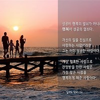 꿈ㆍ비전 - 명언100 탁월한 인물이 가진 특성 가운데 하나는 결코 다른 사람과 자신을 비교하지 않는다는 점이다. 그들은 자신을 자기 자신, 즉 자신이 과거에 이룬 성취와 미래의 가능성과만 비교한다. 탁월한 인물이 가진 특성 가운데 하나는결코 다른 사람과 자신을비교하지 않는다는 점이다. 그들은 자신을 자기 자신,즉 자신이 과거에 이룬 성취와미래의 가능성과만 비교한다. - 브라이언 트레이시 꿈ㆍ비전 - 명언 2017. 9. 20. 더보기 ›› 목표를 설정할 때 마술은 시작되는 것이다. 목표를 설정하는 바로 그 순간, 스위치가 켜지고 물이 흐르기 시작하고 성취하려는 힘이 현실화 되는 것이다. 목표의 목적은 주의를 집중하는 것이다.인간의 의식은 분명한 목적을 갖기 전에는목표 달성을 향해 움직이지 않는다. 목표를 설정할 때 마술은 시작되는 것이다.목표를 설정하는 바로 그 순간,스위치가 켜지고 물이 흐르기 시작하고성취하려는 힘이 현실화 되는 것이다. - 윈 데이비스 꿈ㆍ비전 - 명언 2017. 9. 18. 더보기 ›› 성공이 행복의 열쇠가 아니라 행복이 성공의 열쇠다. 자신의 일을 진심으로 사랑하는 사람이라면 그는 이미 성공한 사람이다. 가장 행복한 사람으로 찬양받을 만한 사람은 가장 많은 사람을 .. 성공이 행복의 열쇠가 아니라행복이 성공의 열쇠다. 자신의 일을 진심으로사랑하는 사람이라면그는 이미 성공한 사람이다. 가장 행복한 사람으로찬양받을 만한 사람은가장 많은 사람을행복하게 해준 사람이다. - 알버트 슈바이처 꿈ㆍ비전 - 명언 2017. 9. 3. 더보기 ›› 당신의 존재는 우연이 아니다. 당신은 대량 생산되지 않았고, 일괄 조립된 상품도 아니다. 당신은 창조주에 의해 신중하게 계획되었고, 특별한 재능을 받았으며, 사랑을 받으며 세상에 나왔다. 당신의 존재는 우연이 아니다.당신은 대량 생산되지 않았고,일괄 조립된 상품도 아니다. 당신은창조주에 의해 신중하게 계획되었고,특별한 재능을 받았으며,사랑을 받으며 세상에 나왔다. - 막스 루카도 (작가)#톡톡힐링 http://tth.kr/1658 꿈ㆍ비전 - 명언 2017. 8. 31. 더보기 ›› 꿈을 가지고 있기만 해서는 안 돼. 꿈은 머리로 생각하는 것이 아니란다. 얘야, 가슴으로 느끼고 손으로 적어 발로 뛰는 게 꿈이지. 꿈을 이루는 가장 좋은 방법은 목표를 세우고,모든 것을 집중하는 거야. 그렇게 하면단지 희망사항이었던 것이 ‘꿈의 목록’으로 바뀌고,다시 그것이 ‘해야만 하는 일의 목록’으로 바뀌고,마침내 ‘이루어 낸 목록’으로 바뀐단다. 꿈을 가지고 있기만 해서는 안 돼.꿈은 머리로 생각하는 것이 아니란다.얘야, 가슴으로 느끼고 손으로 적어발로 뛰는 게 꿈이지. - 존 고다드 꿈ㆍ비전 - 명언 2017. 8. 31. 더보기 ›› 목표를 설정할 때 성공은 이미 시작되는 것이다. 목표를 설정하는 순간 스위치가 켜지고 물이 흐르기 시작하고 성취하려는 힘이 현실화 되는 것이다. 목표는 주의를 집중하는 것이다.인간의 의식은 분명한 목적을 갖기 전에는목표의식을 향해 움직이지 않는다. 목표를 설정할 때 성공은 이미 시작되는 것이다.목표를 설정하는 순간스위치가 켜지고 물이 흐르기 시작하고성취하려는 힘이 현실화 되는 것이다. - 린 데이비스 꿈ㆍ비전 - 명언 2017. 6. 28. 더보기 ›› 명확한 목적이 있는 사람은 가장 험난한 길에서 조차도 앞으로 나아가고, 아무런 목적이 없는 사람은 가장 순탄한 길에서 조차도 앞으로 나아가지 못한다. 명확한 목적이 있는 사람은가장 험난한 길에서 조차도앞으로 나아가고, 아무런 목적이 없는 사람은가장 순탄한 길에서 조차도앞으로 나아가지 못한다. - 토머스 카알라일 꿈ㆍ비전 - 명언 2017. 6. 26. 더보기 ›› 우리는 세상을 살아가는 동안 인생 초반에는 ‘자신이 한 일’에 대해 후회하다가 중반을 넘어서 부터는 ‘자신이 하지 않은 일’에 대해 후회하는 일이 더 많아진다. 동년배들 가운데 실패한 일에 대해서가 아니라하지 않은 일에 대해 후회하는 사람들이점점 더 많아지기 시작했다. 우리는 세상을 살아가는 동안인생 초반에는 ‘자신이 한 일’에 대해 후회하다가 중반을 넘어서 부터는‘자신이 하지 않은 일’에 대해 후회하는 일이 더 많아진다. - 엘링 카게, ‘생각만큼 어렵지 않다’에서 꿈ㆍ비전 - 명언 2017. 6. 26. 더보기 ›› 절실히 원하는 것은 이루어지게 되어있다. 여러분의 마음속에 영순위는 반드시 이루어진다. 아직도 못 이뤄진 것은 영순위가 안 되었기 때문이다. 절실히 원하는 것은 이루어지게 되어있다.여러분의 마음속에 영순위는반드시 이루어진다. 아직도 못 이뤄진 것은영순위가 안 되었기 때문이다. - 게이트, ‘깨달음의 연금술’에서 꿈ㆍ비전 - 명언 2017. 4. 20. 더보기 ›› 재미있는 일이야. 악착스레 모은 돈이나 재산은 그 누구의 마음에도 남지 않지만 숨은 적선, 진실한 충고, 따뜻한 격려의 말 같은 것은 언제까지나 남게 되니 말이야. 일생을 바친 다음에 남는 것은우리가 모은 것이 아니라 우리가 남에게 준 것이다.재미있는 일이야. 악착스레 모은 돈이나 재산은그 누구의 마음에도 남지 않지만 숨은 적선, 진실한 충고, 따뜻한 격려의 말 같은 것은언제까지나 남게 되니 말이