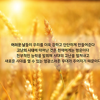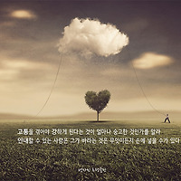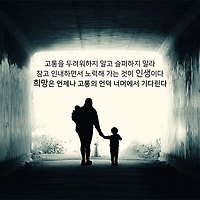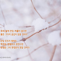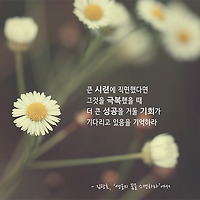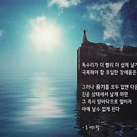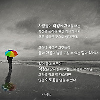 역경ㆍ고난 - 명언94 목표가 분명한 영웅은 시련을 두려워하지 않는다. 영웅이 되느냐, 마느냐는 시련을 얼마나 잘 이겨내는지에 달려있다. 큰 시련에 직면했다면 그것을 극복했을 때 더 큰 성공을 거둘 기회가.. 추녀 끝에 걸어 놓은 풍경은바람이 불지 않으면 소리가 나지 않는다. 태풍이 없으면 바다는오염 물질을 걸러내지 못해 살지 못한다. 목표가 분명한 영웅은시련을 두려워하지 않는다. 영웅이 되느냐, 마느냐는시련을 얼마나 잘 이겨내는지에 달려있다.큰 시련에 직면했다면 그것을 극복했을 때더 큰 성공을 거둘 기회가기다리고 있음을 기억하라. - 김광호, ‘영웅의 꿈을 스캔하라’에서 역경ㆍ고난 - 명언 2019. 4. 22. 더보기 ›› 시간, 돈, 인력, 경험이 부족해. 질질 짜는 소리는 이제 그만. 오히려 적을수록 좋다. 제약은 저주의 가면을 쓴 축복이다. 자원이 부족하면 현재 가진 것을 최대한 활용해야 한다. “시간, 돈, 인력, 경험이 부족해.”질질 짜는 소리는 이제 그만.오히려 적을수록 좋다. 제약은 저주의 가면을 쓴 축복이다.자원이 부족하면현재 가진 것을 최대한 활용해야 한다.다시 말해, 낭비가 사라진다.그리고 제약 속에서창의적인 아이디어가 나온다. - 제이슨 프라이드 역경ㆍ고난 - 명언 2019. 3. 16. 더보기 ›› 독수리가 더 빨리, 더 쉽게 날기 위해 극복해야 할 유일한 장애물은 공기다. 그러나 공기를 모두 없앤 다음 진공 상태에서 날게 하면, 그 즉시 땅바닥으로 떨어져 아예 날수 없게 된다. 독수리가 더 빨리, 더 쉽게 날기 위해극복해야 할 유일한 장애물은 ‘공기’다. 그러나 공기를 모두 없앤 다음진공 상태에서 날게 하면,그 즉시 땅바닥으로 떨어져아예 날수 없게 된다. 공기는 저항이 되는 동시에비행을 위한 필수조건이기 때문이다. 마찬가지로 인간의 삶에서도장애물이 성공의 조건이다. - 존 맥스웰 역경ㆍ고난 - 명언 2019. 1. 24. 더보기 ›› 고통을 겪어야 강하게 된다는 것이 얼마나 숭고한 것인가를 알라. 인내할 수 있는 사람은, 그가 바라는 것은 무엇이든지 손에 넣을 수가 있다. 고통을 겪어야 강하게 된다는 것이얼마나 숭고한 것인가를 알라. 인내할 수 있는 사람은,그가 바라는 것은 무엇이든지손에 넣을 수가 있다. - 벤자민 프랭클린 역경ㆍ고난 - 명언 2018. 12. 26. 더보기 ›› 우리 삶에 만일 겨울이 없다면 봄은 그다지 즐겁지 않을 것이다. 만일 우리가 때때로 역경을 경험하지 못한다면 번영은 그리 환영받지 못할 것이다. 우리 삶에 만일 겨울이 없다면봄은 그다지 즐겁지 않을 것이다. 만일 우리가 때때로 역경을 경험하지 못한다면번영은 그리 환영받지 못할 것이다. - 앤 브래드스트리트 역경ㆍ고난 - 명언 2018. 12. 7. 더보기 ›› 장애물을 만나면 이렇게 생각하라. 내가 너무 일찍 포기하는 것이 아닌가? 실패한 사람들이 현명하게 포기할 때, 성공한 사람들은 미련하게 참는다. 장애물을 만나면 이렇게 생각하라.“내가 너무 일찍 포기하는 것이 아닌가?” 실패한 사람들이 '현명하게' 포기할 때,성공한 사람들은 ‘미련하게’ 참는다. - 마크 피셔 역경ㆍ고난 - 명언 2018. 11. 12. 더보기 ›› 지혜로운 사람들은 대부분 역경이나 고난을 극복한 경험이 있었다. 인생의 쓴 맛을 본 사람들이 순탄한 삶을 살아온 사람들보다 훨씬 지혜로웠다 독일 베를린의 막스 플랑크 교육 연구소가15년 동안 1천명을 대상으로 연구한 끝에지혜로운 사람들은다음과 같은 공통점을 갖는다고 밝혔다. ‘지혜로운 사람들은대부분 역경이나 고난을 극복한 경험이 있었다.인생의 쓴 맛을 본 사람들이순탄한 삶을 살아온 사람들보다 훨씬 지혜로웠다’ - 차동엽 신부, ‘뿌리 깊은 희망’에서 역경ㆍ고난 - 명언 2018. 11. 11. 더보기 ›› 어려운 날들이 우리를 더욱 강하고 단단하게 만들어준다. 고난의 시대에 태어난 것은 천재에게는 행운이다. 천부적인 능력을 발휘해 시대의 고난을 떨쳐내고 새로운 시대를 열 수 있는 영광.. 어려운 날들이 우리를더욱 강하고 단단하게 만들어준다. 고난의 시대에 태어난 것은천재에게는 행운이다. 천부적인 능력을 발휘해시대의 고난을 떨쳐내고새로운 시대를 열 수 있는영광스러운 무대가 주어지기 때문이다. - 괴테 역경ㆍ고난 - 명언 2018. 10. 30. 더보기 ›› 약이 몸에 쓰듯이 역경은 잠시 몸에 괴롭고 마음에 쓰지만 그것을 참고 잘 다스리면 많은 이로움을 얻을 수 있다. 사람들이 역경에 처했을 때는자신을 둘러싼 환경 하나하나가모두 불리한 것으로 생각된다. 그러나 사실은 그것들이몸과 마음의 병을 고칠 수 있는 힘과 약이다. 약이 몸에 쓰듯이 역경은잠시 몸에 괴롭고 마음에 쓰지만그것을 참고 잘 다스리면많은 이로움을 얻을 수 있다. - 채근담 역경ㆍ고난 - 명언 2018. 10. 28. 더보기 ›› 인생은 평화와 행복만으로는 지속될 수 없다. 고통과 노력이 필요하다. 고통을 두려워하지 말고 슬퍼하지 말라. 참고 인내하면서 노력해 가는 것이 인생이다. 희망은 언제나 고통의 언덕 너머.. 인생은평화와 행복만으로는 지속될 수 없다.고통과 노력이 필요하다. 고통을 두려워하지 말고 슬퍼하지 말라.참고 인내하면서 노력해 가는 것이 인생이다. 희망은 언제나 고