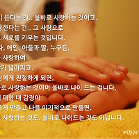 올바로 나이 든다는 건 올바로 사랑하는 것이고, 올바로 사랑한다는 건 그 사랑으로 내가 자라고 서로를 키우는 것입니다. 친구, 배우자, 애인, 아들과 딸, 누구든, 우리가 그를 사랑하여 우리의 시야가 넓어지고, 더 많은 사람에게 친절하게 되면,우리는 올바로 사랑하는 것이며올바로 나이 드는 겁니다. 어떤 사람에 대한 내 감정이내 시야를 좁게 만들고나를 이기적으로 만들면, 나는 올바로 사랑하는 것도 올바로 나이드는 것도 아닙니다. - 우먼에서 휴먼으로